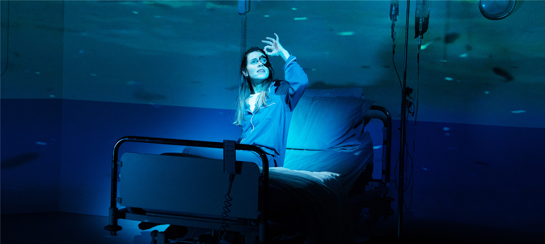 Η σκηνική δράση συνδυάζει ρεαλισμό και φαντασία: το video mapping μεταμορφώνει το νοσοκομειακό σκηνικό σε υδάτινη άβυσσο, όπου πραγματικότητα και όνειρο διαπλέκονται.